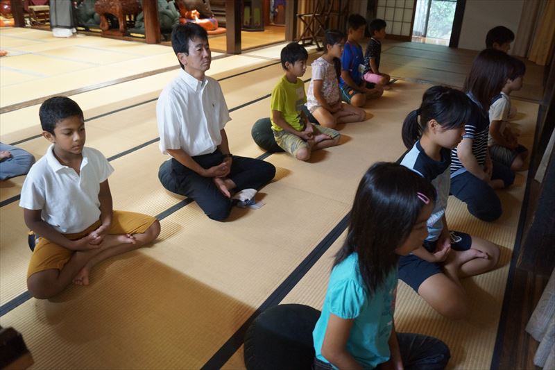 集まった子どもたちは、まず最初に坐禅の仕方を教わり、みんなで坐りました。