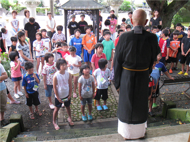 住職はお話をし、子どもたちに、たくわんで器をきれいにしたお湯も残さず飲むように教えました。