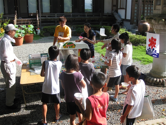 お土産をもらって記念撮影後、かき氷を振舞いました。