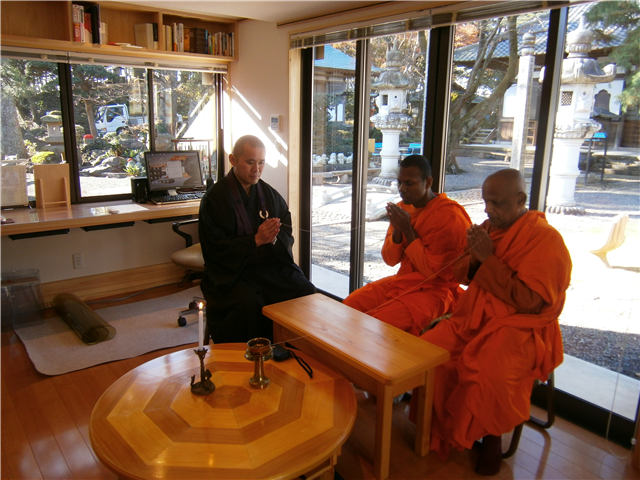そこで、12月10日(土)午前中、スリランカ僧侶(スマンゲルさん、チャンダナンダさん)と共に、新寺務所落慶法要を行いました。
