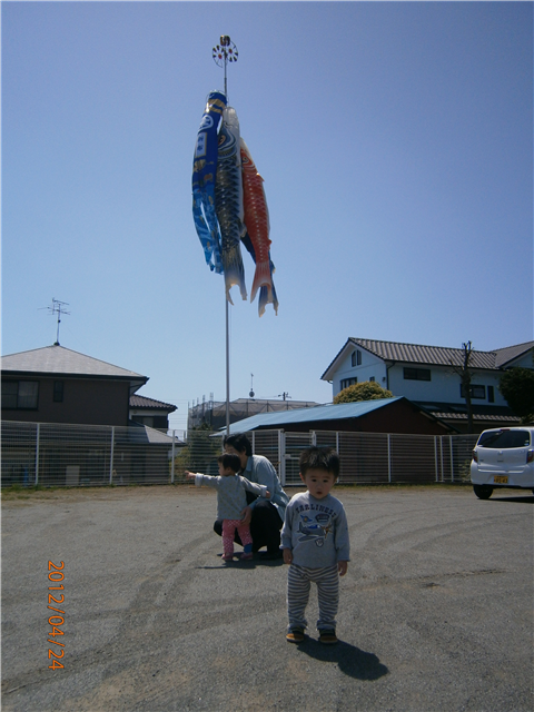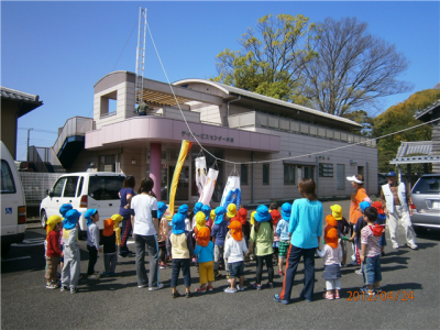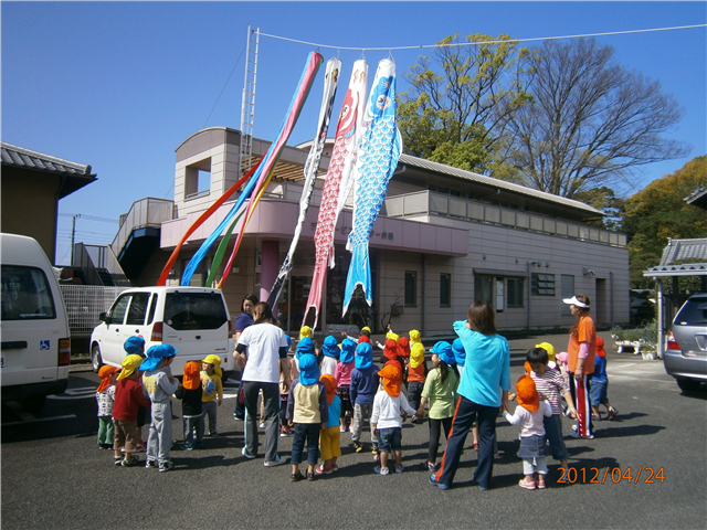 私の鯉のぼりをあげている最中、園児たちが集まり、上がっていく様子を見ながら、「鯉のぼり」の歌を合唱してくれました。