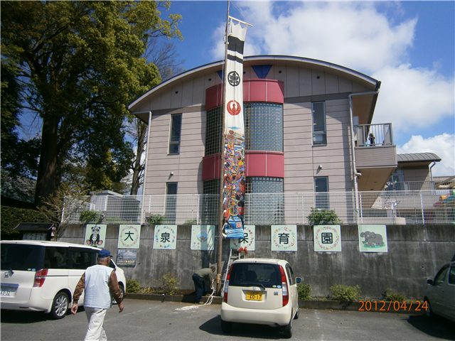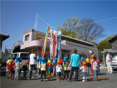 まだまだ十分使えそうだったので、4月24日(火)、門前町の皆さん協力のもと、幟旗・鯉のぼりを上げ、保育園の子どもたちの成長を願いました。