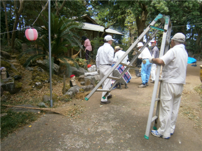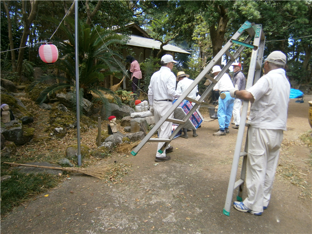 大勢の方々におこしいただき、竹藪の伐採や整理、境内地の掃き掃除や草取り、お盆用提灯設営などをしました。